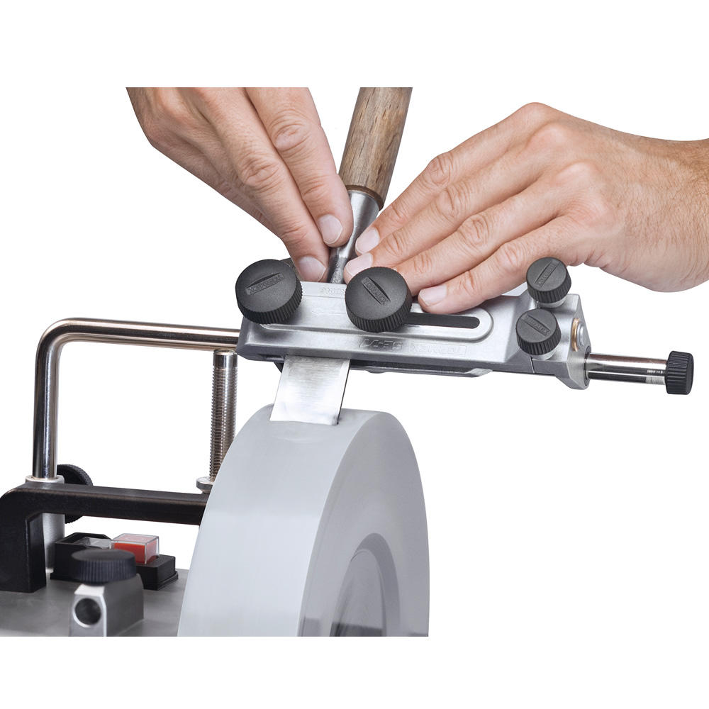 Für Hobeleisen und Stechbeitel. Auch für japanische Stemmeisen geeignet. Durch zwei Einstellrädchen können auch leicht konvexe Schneidenformen geschärft werden (bei T-8 enthalten).