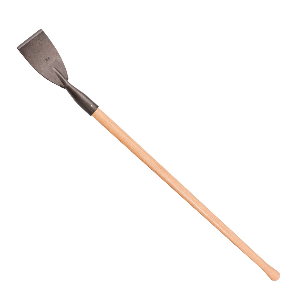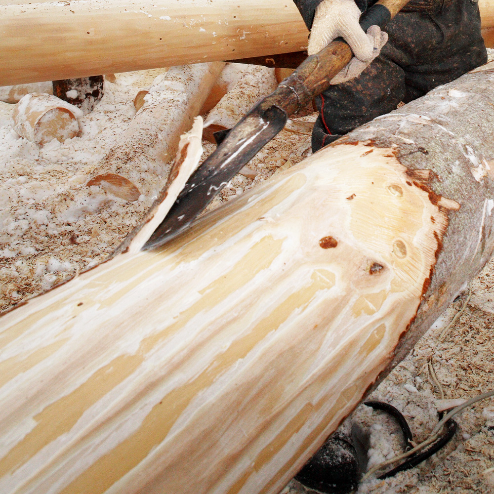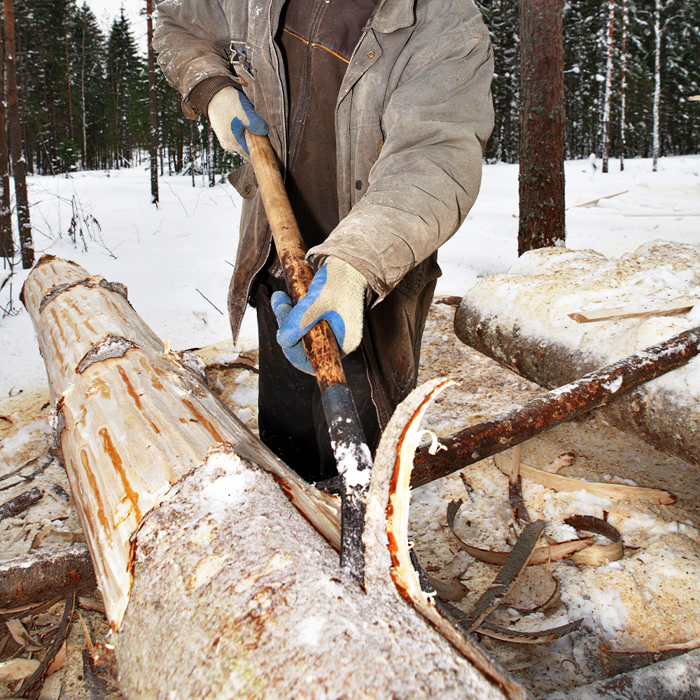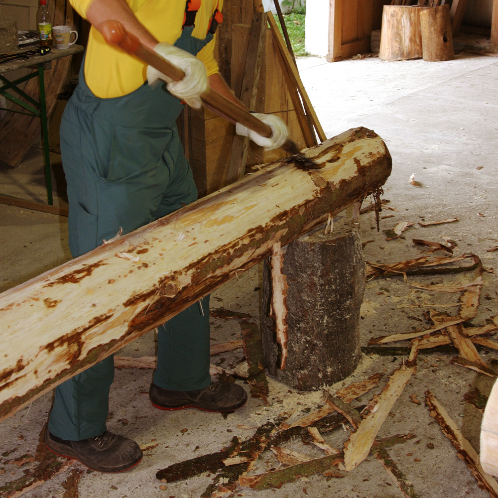 Nach dem Fällen sollten Sie den Stamm zuerst flächenbündig entasten. Die Wirkungsweise des Schäleisens ähnelt der eines Hobels. Beim Abschälen wird die Schneide entlang der Wuchsrichtung des Baumes gestoßen, sodass die Rinde in langen Streifen abfällt. Um dies effektiv und sicher ausführen zu können, sollte der Stiel oder Holzgriff eine Länge von ca. 1,20 bis 1,30 m haben. Wenden bzw. drehen Sie das Schäleisen, um den Schneidenwinkel an Ihre Position anzupassen. Direkt am Stamm haben Sie die beste Kraftübertragung in Stoßrichtung. Die Klinge sollte nicht zu scharf sein, damit sie nicht ins Holz schneidet.