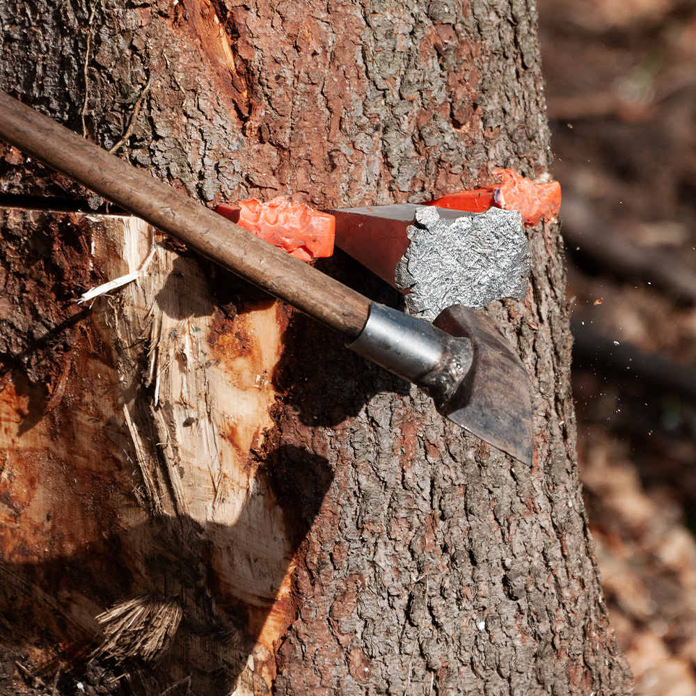 - Fällkeil: Diese Keile werden verwendet, um Bäume sicher und kontrolliert zu fällen. Nachdem der Fällschnitt am Baum vorgenommen wurde, wird der Fällkeil in den Schnittspalt geschlagen. Dadurch wird der Spalt verbreitert und der Baum in die gewünschte Fallrichtung gelenkt. Besonders nützlich sind mechanische Fällkeile, die durch eine eingebaute Mechanik eine zusätzliche Spreizkraft erzeugen. Dies reduziert den körperlichen Kraftaufwand und erhöht die Präzision beim Fällen des Baumes.