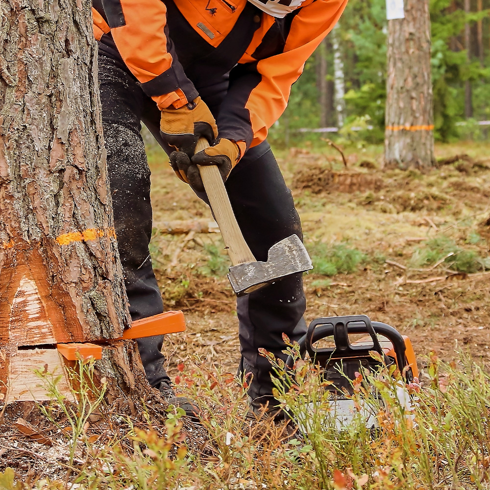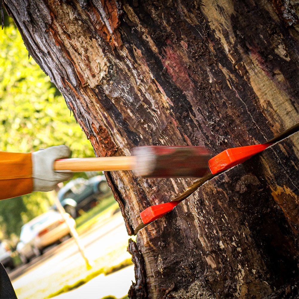- Schlagen Sie den Fällkeil nur mit einem geeigneten Werkzeug ein (z. B. Spalthammer / Schlegelaxt).