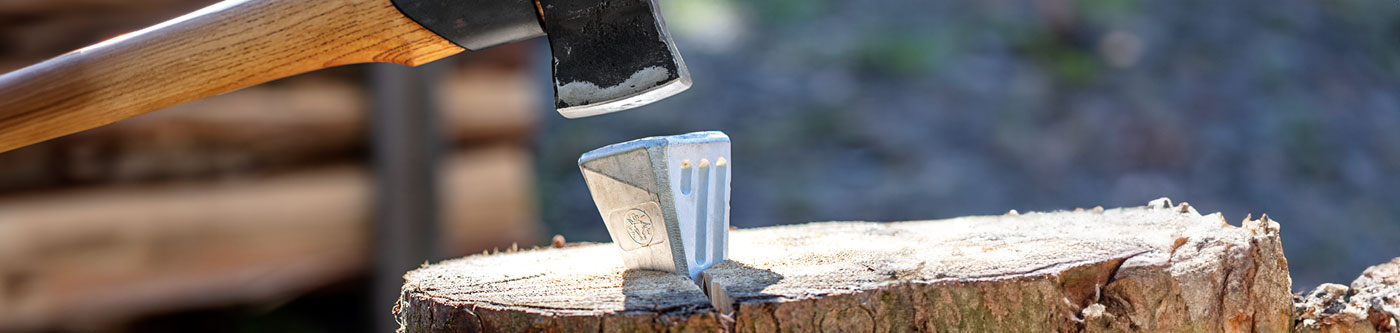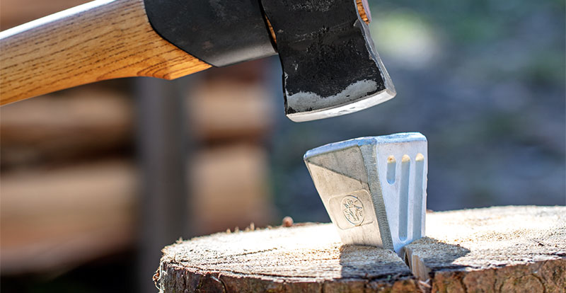 - Zweiter Spaltkeil: Reicht ein Keil nicht aus, um das Holzstück zu spalten, treiben Sie einen zweiten Spaltkeil an einer schmalen Stelle des Spalts ein, um ihn weiter zu öffnen.