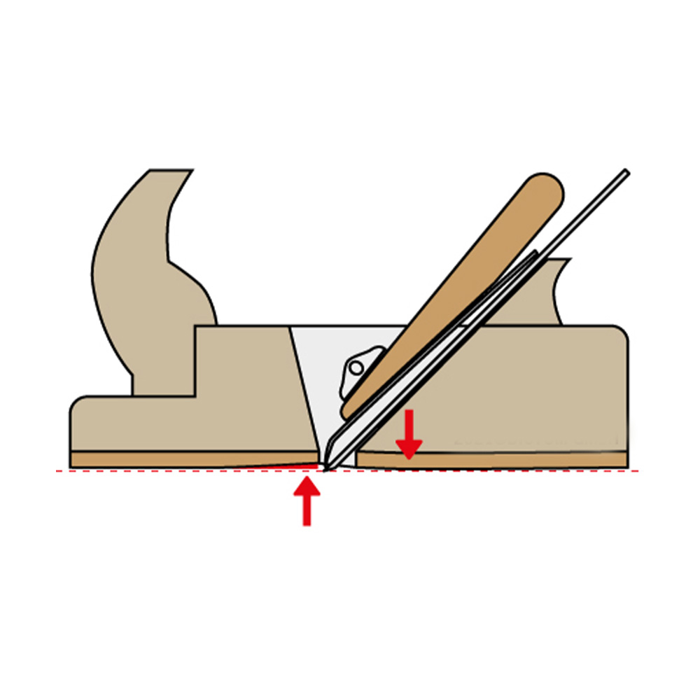 Um die richtige Einstellung zu finden, justieren Sie das Hobeleisen in kleinen Schritten. Beginnen Sie mit einer geringen Zustellung und tasten Sie sich langsam vor, indem Sie das Eisen leicht vorschieben. Achten Sie darauf, dass das Hobeleisen links und rechts an den Ecken gleichmäßig aus der Hobelsohle herausragt.